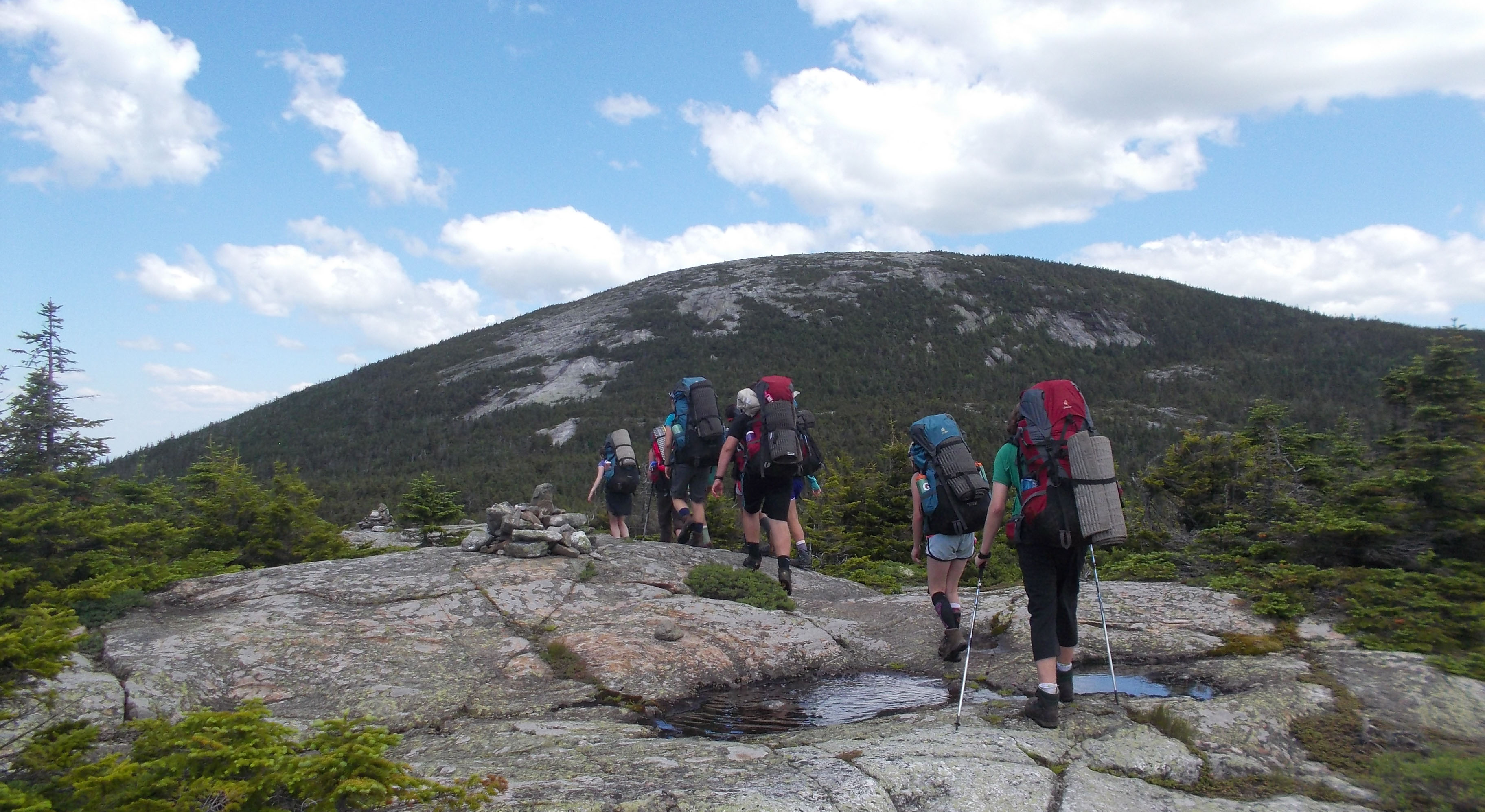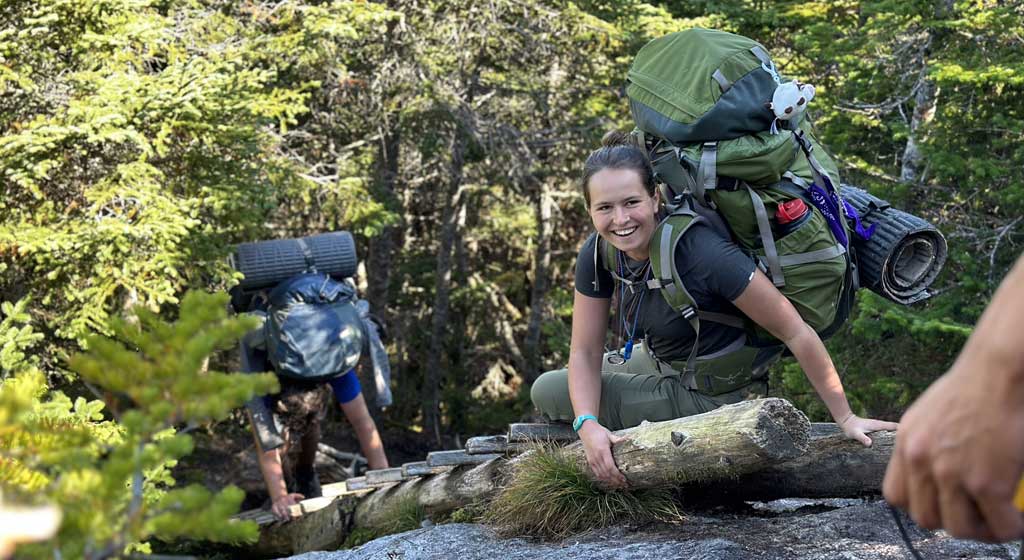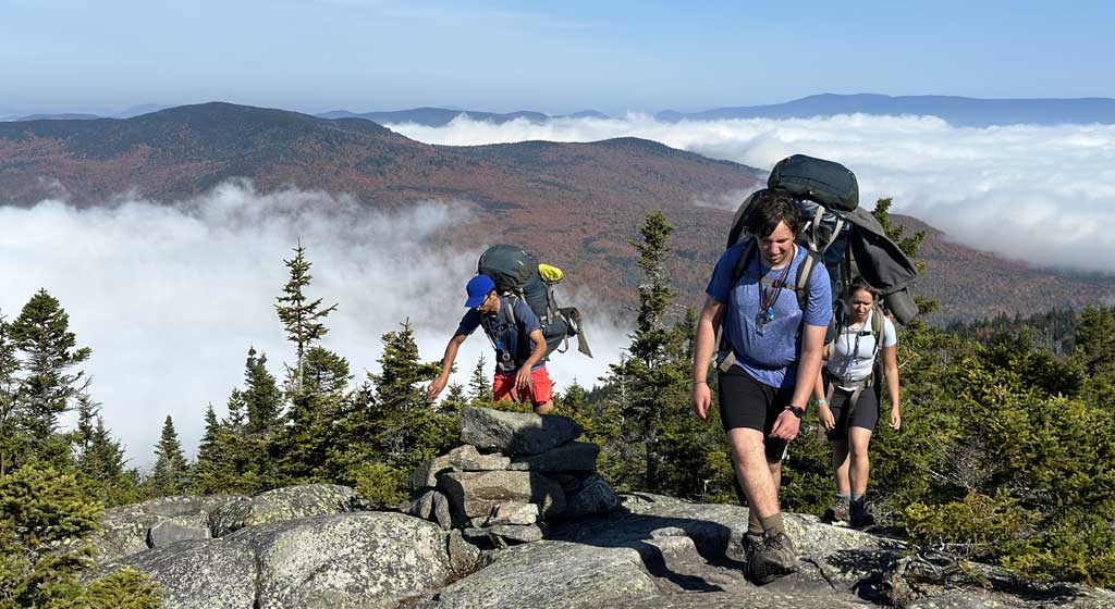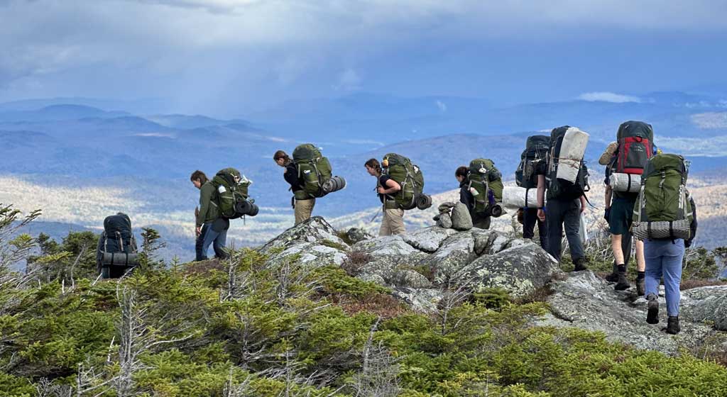 Backpacking is an ideal combination of both team and individual elements, requiring students to dig deep on a personal level while also looking out for other group members. The mountains of Maine and New Hampshire are jagged and densely wooded and the trails are remote, narrow and often steep. Students travel on wilderness footpaths, navigating on and off trail throughout the journey. From atop mountain peaks, if the weather cooperates, the group’s hard work is rewarded with spectacular views across forested landscapes. Living and traveling with just a backpack is a simple existence, in which deceptively small choices can make great differences. To live well in the wilderness, all crew members must share the chores that turn a camp into a home, including setting up tents and tarps, creating a kitchen area, taking turns fetching water, and cooking satisfying meals. Students will also take turns in expeditionary roles, so that they have the opportunity to learn and gain proficiency in a variety of skills.